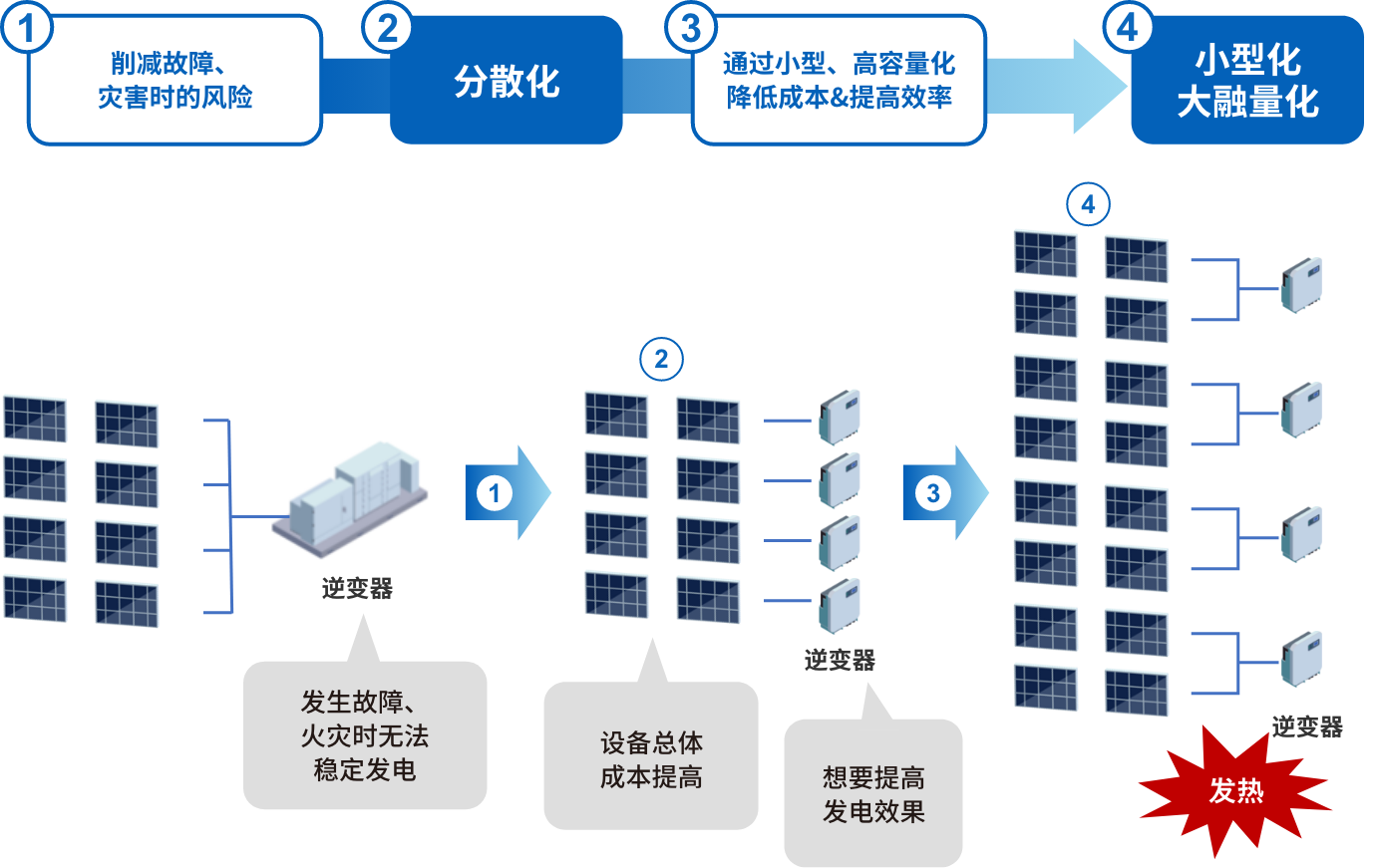 近年來(lái),太陽(yáng)能發(fā)電系統(tǒng)上的需求不斷發(fā)生變化。作為地震或水災(zāi)等災(zāi)害風(fēng)險(xiǎn)對(duì)策,更加穩(wěn)定的電力供給需求愈發(fā)高漲,并出現(xiàn)了從集中型系統(tǒng)向分散型系統(tǒng)轉(zhuǎn)化的趨勢(shì)。并非通過(guò)1臺(tái)光伏逆變器執(zhí)行電力轉(zhuǎn)換,而是分散至多臺(tái)光伏逆變器,由此降低了發(fā)生災(zāi)害時(shí)因設(shè)備故障等所致發(fā)電停止的風(fēng)險(xiǎn)。此外,各設(shè)備或機(jī)器上通過(guò)高容量、大電流化的配置提高了發(fā)電效率,并通過(guò)小型化、輕量化削減了設(shè)備投資,因而要求有效利用設(shè)備的呼聲愈發(fā)高漲。而另一方面,伴隨小型化、高容量化的發(fā)展,當(dāng)務(wù)之急是減少設(shè)備本身產(chǎn)生的熱量,這是造成能量損失和降低設(shè)備使用壽命的一個(gè)因素。