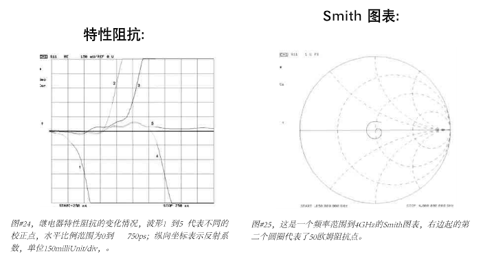 如果您需要觀察不同的RF頻率或者一個特定頻率,Smith圖表可以呈現(xiàn)在一定頻率范圍內(nèi)的特性抗阻的變化情況。Smith圖會以50KHz為單位一直描繪到4GHz的頻率反應(yīng)情況。圖#25中繪制出的點是以純實部50歐姆為圓心分布的。為了更清楚理解Smith圖表,由右邊起點延伸過來的圓實際上就是50歐姆的阻抗圓,圓的水平中心線是實軸,位于這條中線之上呈現(xiàn)感性,而位于中線之下則呈現(xiàn)為容性。如圖所示,CRF繼電器的測量結(jié)果都位于50歐姆附近。