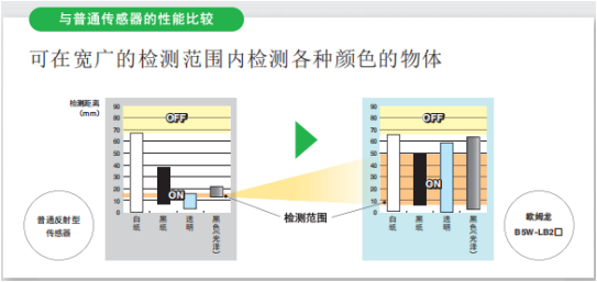 與普通傳感器的性能比較,歐姆龍可在寬廣的檢測范圍內(nèi)檢測各種顏色物體