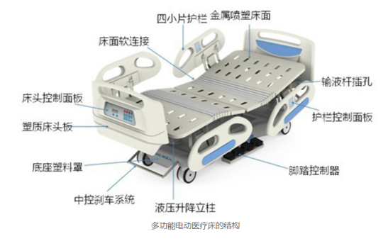多功能電動(dòng)醫(yī)療床由ABS床頭、ABS提升護(hù)欄、床板、上床架、下床架、升降連桿、電動(dòng)推桿、控制器、手控板萬(wàn)向輪等主要部件組成。