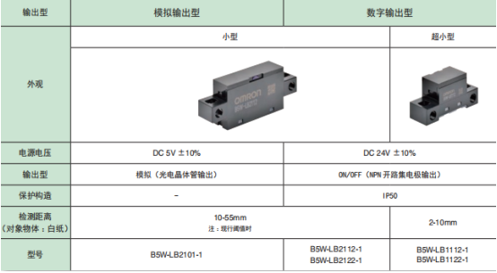 歐姆龍限定反射傳感器B5W-LB系列檢測范圍廣,因此耐物體位置偏移強,不易受外部干擾影響的設(shè)計。備有模擬電壓輸出和數(shù)字輸出兩種輸出模式。