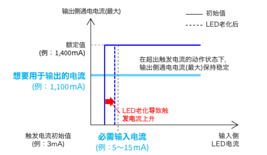 晶體管耦合器在增大輸入側(cè)電流時,輸出側(cè)電流也會變大,所以與MOS FET繼電器相比,會消耗更多的電力。LED老化會使輸出也跟隨減弱,由此需要更多的電力;