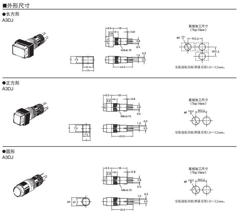 軀干長(zhǎng)18mm、 圓軀干型f8系列 ●高亮度的均一表面發(fā)光。 ●圓形便于開孔。 ●形狀小巧,操作感好。