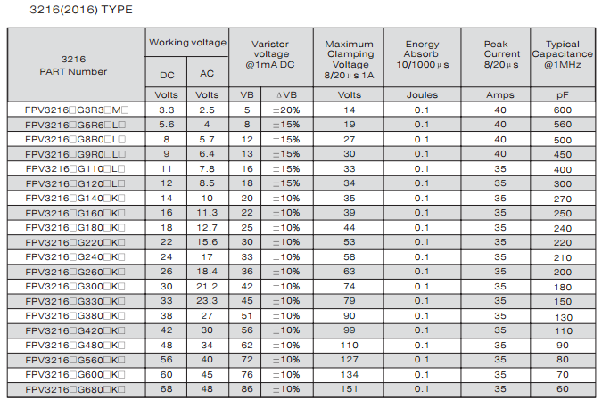 特征: 1、疊層片式陶瓷結構。 2、無引線。 3、溫度范圍:-55℃~+125 ℃。 4、工作電壓范圍V w(dc)=3.3~ 615V。 5、具有雙向限制特性,適合ESD保護。 6、漏電流非常小。 7、寄生電感小、響應速度快(響應時間少于0.5ns)。 8、優(yōu)良的溫度系數(shù)。 9、良好的焊接性能(端電極為三層電鍍)。 應用: 1、防止過電壓:當施加的電壓升高到壓敏電壓時,壓敏電阻器的電流急劇上升,被保護設備的浪涌電壓迅速減小,從而使裝有壓敏電阻器的設備抗浪涌噪聲能力達到相應要求。壓敏