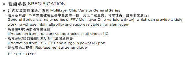特征: 1、疊層片式陶瓷結(jié)構(gòu)。 2、無(wú)引線。 3、溫度范圍:-55℃~+125 ℃。 4、工作電壓范圍V w(dc)=3.3~ 615V。 5、具有雙向限制特性,適合ESD保護(hù)。 6、漏電流非常小。 7、寄生電感小、響應(yīng)速度快(響應(yīng)時(shí)間少于0.5ns)。 8、優(yōu)良的溫度系數(shù)。 9、良好的焊接性能(端電極為三層電鍍)。 應(yīng)用: 1、防止過(guò)電壓:當(dāng)施加的電壓升高到壓敏電壓時(shí),壓敏電阻器的電流急劇上升,被保護(hù)設(shè)備的浪涌電壓迅速減小,從而使裝有壓敏電阻器的設(shè)備抗浪涌噪聲能力達(dá)到相應(yīng)要求。